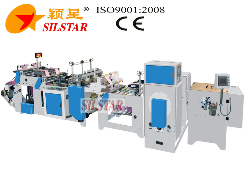 本机是一套制袋机加贴标机。主机为双通道高速的平口八折垃圾袋制袋机,采用两套伺服电机控制袋长,气缸上料气动刹车放料。最快速度能达单道250只。如配套贴标机,速度最快可达一道200只一分钟